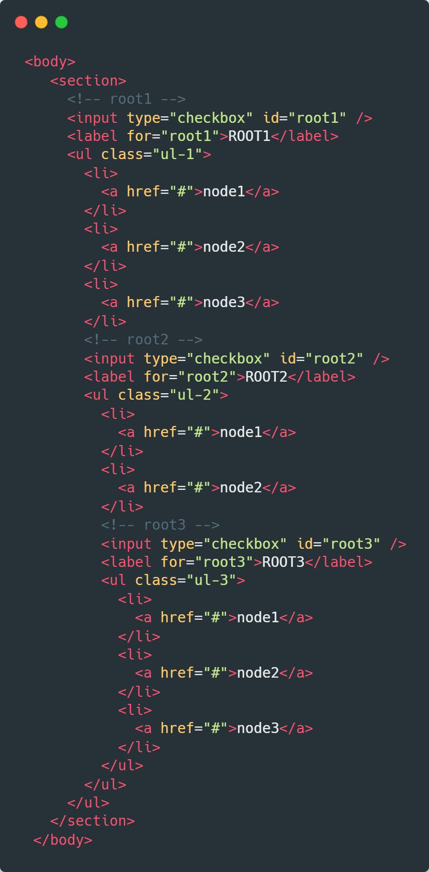 html, css를 좀 더 연습하고 싶어서 사이트를 돌아다니면서 구현하고 싶은 것을 골랐다. tree구조로 동작할 수 있게 만드는 건데 이렇게 간단한 걸 구현하면서도 모르는 게 참 많았다.