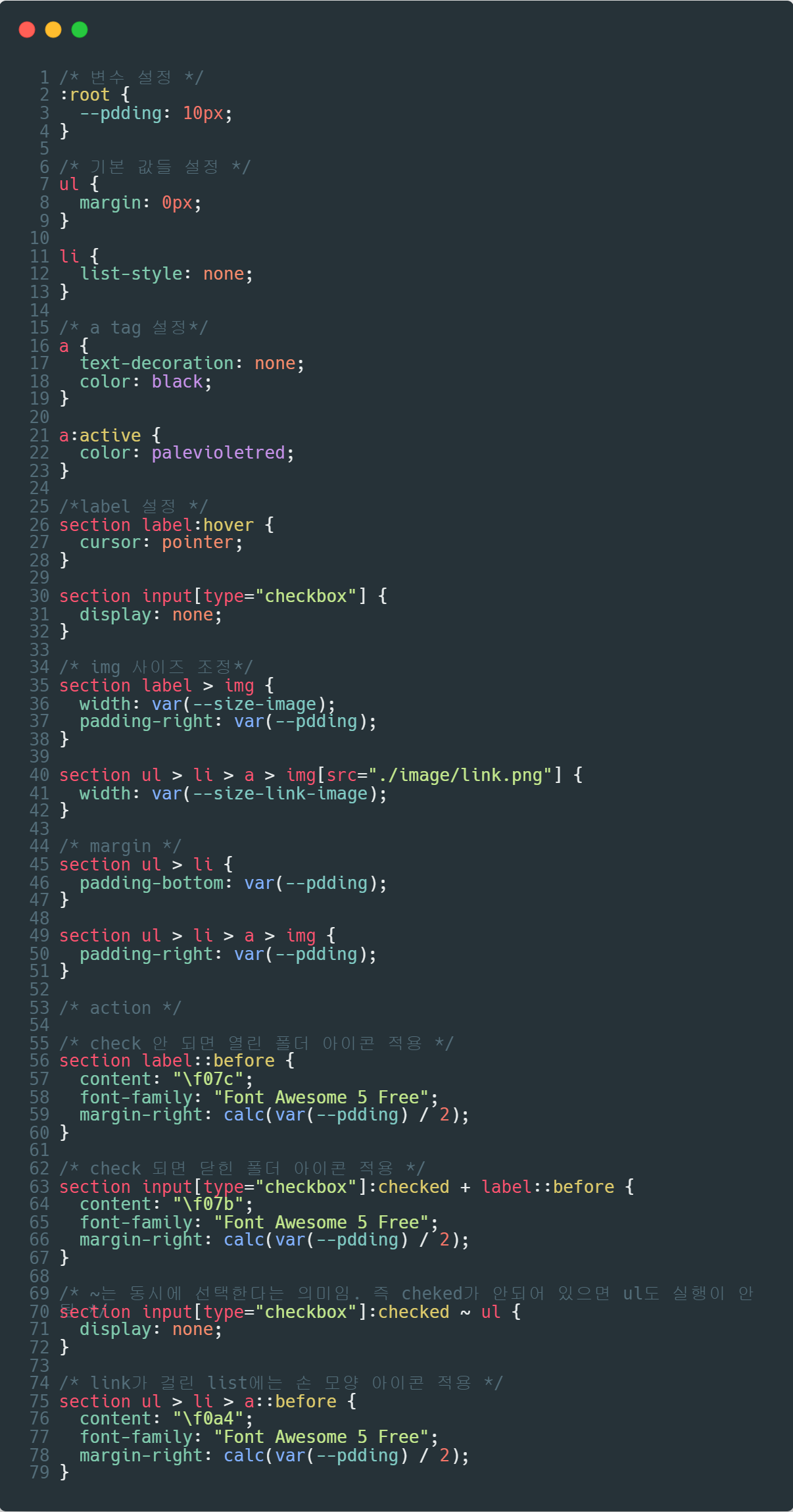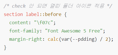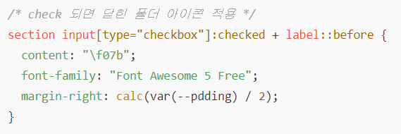 :cheked가 붙지 않았을 때는 열린 폴더 아이콘이 보일 수 있도록 작성했고, :cheked를 붙였을 때는 닫힌 폴더 아이콘이 보일 수 있도록 작성했다. font awesome 아이콘을 적용하려면 content attribute값으로 사이트에 나와있는 \+16진수와 font-family attribute값으로 "Font Awesome 5 Free"를 주면 된다.