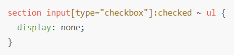 먼저 checkbox 또는 label을 클릭하면 checkbox가 checked상태가 되는데 이를 이용하면 된다. 나는 cheked라면 ul(트리에서 자식노드 역할)의 display가 사라질 수 있도록 다음과 같이 작성했다.